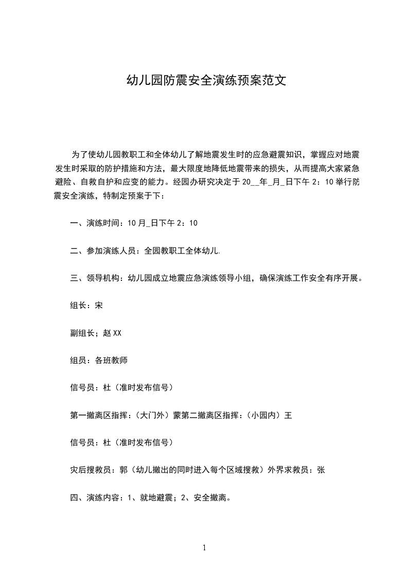 为了使幼儿园教职工和全体幼儿了解地震发生时的应急避震知识,掌握应对地震发生时采取的防护措施和方法,最大限度地降低地震带来的损失,从而提高大家紧急避险、自救自护和应变的能力。经园办研究决定于20__年_月_日下午2:10举行防震安全演练,特制定预案于下: