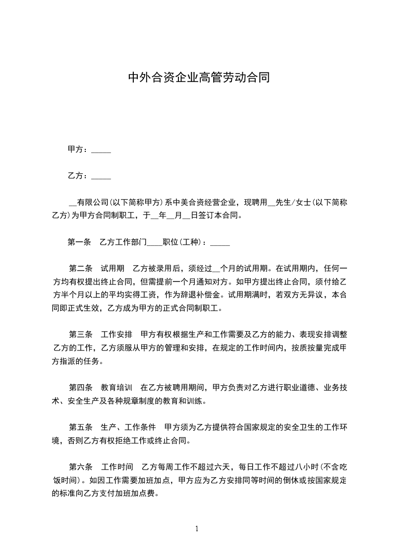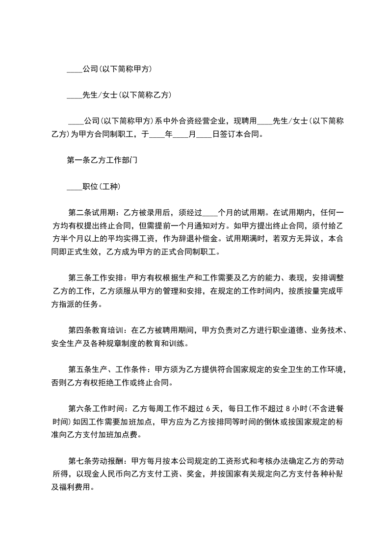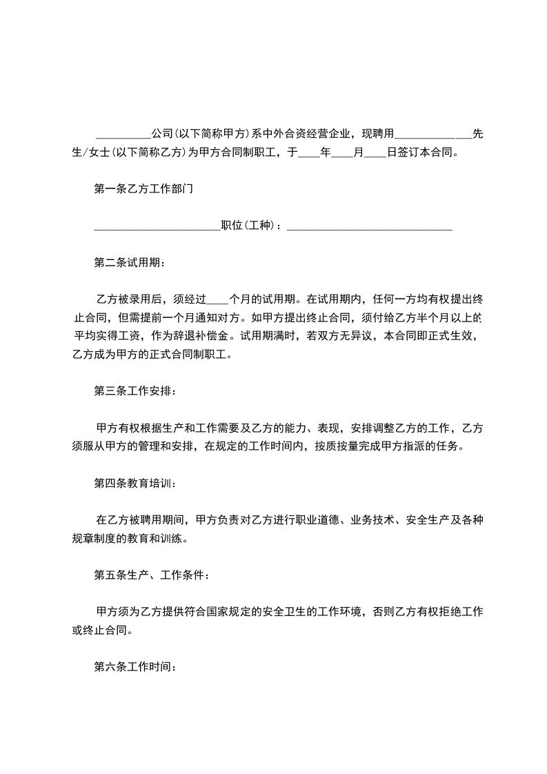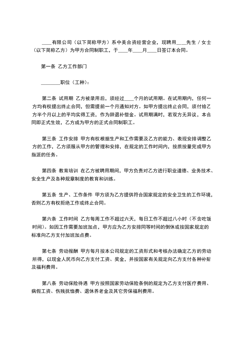 __有限公司(以下简称甲方)系中美合资经营企业,现聘用__先生/女士(以下简称乙方)为甲方合同制职工,于__年__月__日签订本合同。