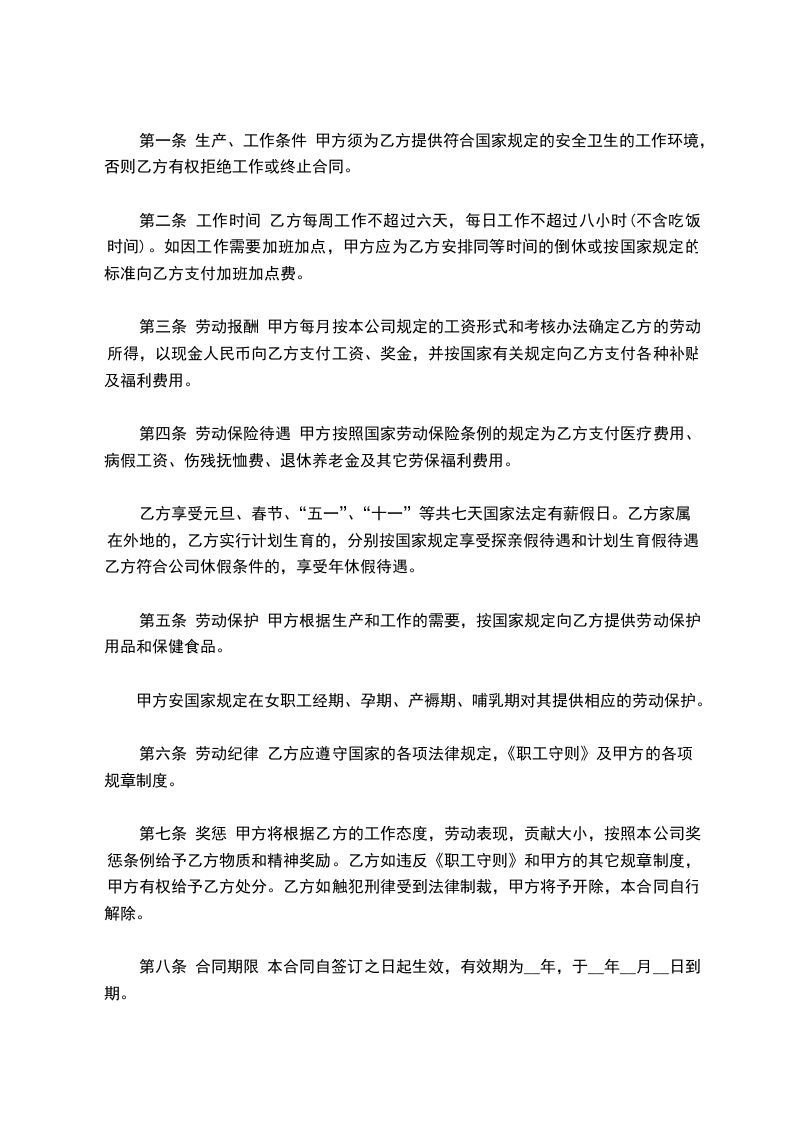 第五条 生产、工作条件 甲方须为乙方提供符合国家规定的安全卫生的工作环境,否则乙方有权拒绝工作或终止合同。