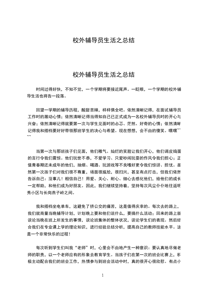 一切才刚刚开始,从这一次的工作中,我觉得自己收获了很多。作为一名校辅,你首先必须要热爱这份工作,才能真正投入其中。因为在与老师、同学的相处中,总不可避免的出现一些问题,只有怀着对自己所热爱的事的执着追求,你才有勇气克服困难,坚持到底坚持到底。其次,我觉得在工作中还应该有足够的耐心、细心和责任心。在以后的校辅工作中,我将尽可能多的与学生交流,跟他们建立更好的关系,做一个合格的校外辅导员。