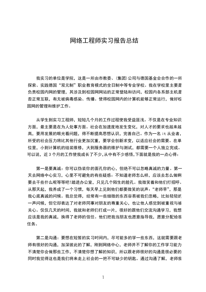 我实习的单位是学院,这是一所由市教委、(集团)公司与德国基金会合作的一所探索、实践德国“双元制”职业教育模式的全日制中等专业学校。我在学校里主要是负责校园内网的管理,其涉及到校园网网站的正常登陆和访问,校园内各系部主机是否正常互联,有无被病毒感染、传播。使得校园网内的计算机能够正常运行,做好校园网的管理和维护工作。