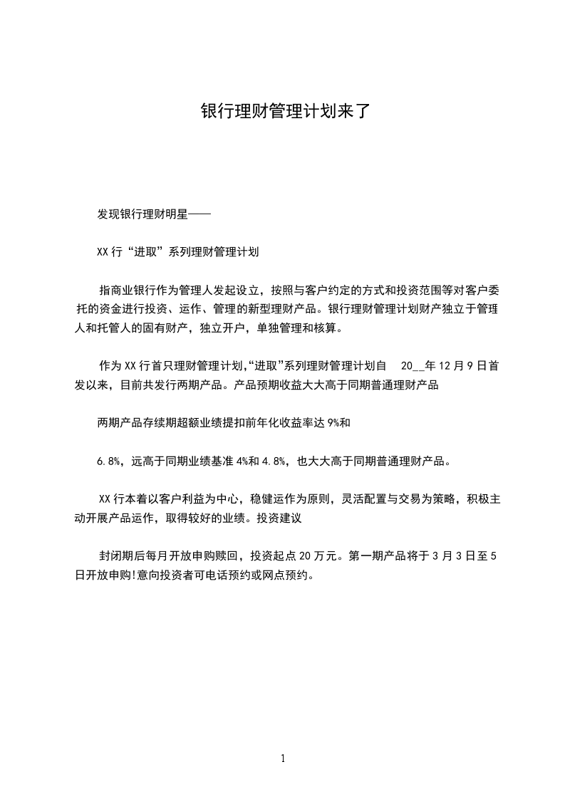 作为XX行首只理财管理计划,“进取”系列理财管理计划自20__年12月9日首发以来,目前共发行两期产品。产品预期收益大大高于同期普通理财产品