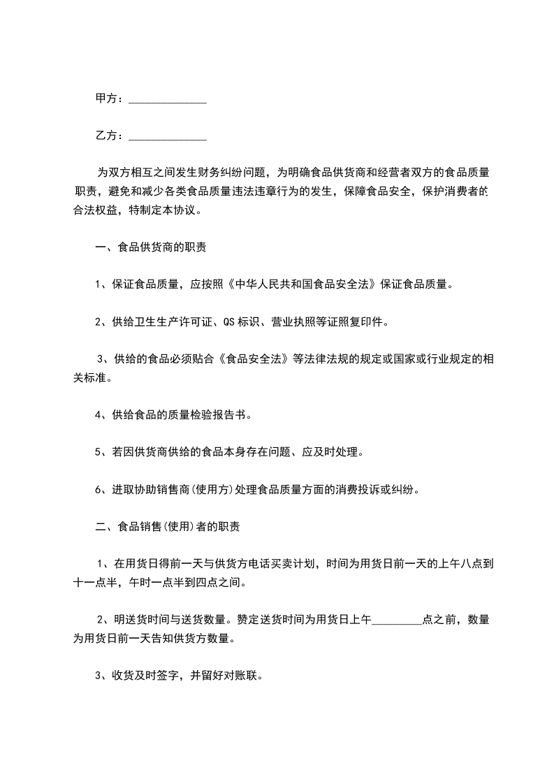5、乙方应按甲方要求按质、按量、按时送货,如出现送货不及时给甲方带来的所有经济损失,将由乙方全部承担相关职责。