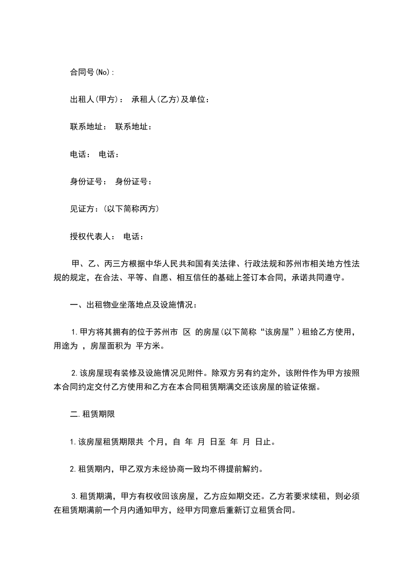 1.甲方将其拥有的位于苏州市 区 的房屋(以下简称“该房屋”)租给乙方使用,用途为 ,房屋面积为 平方米。