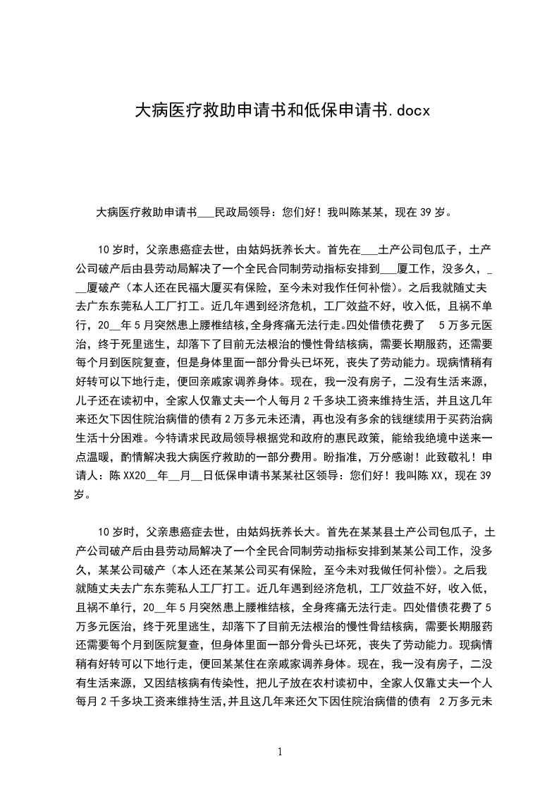 大病医疗救助申请书