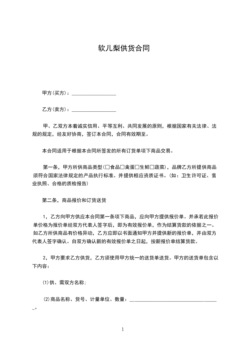 第一条,甲方所供商品类型(□食品□禽蛋□生鲜□蔬菜),品牌乙方所提供商品须符合国家法律规定的产品执行标准。并提供相应资质证书。(如:卫生许可证、营业执照、合格的质检报告)