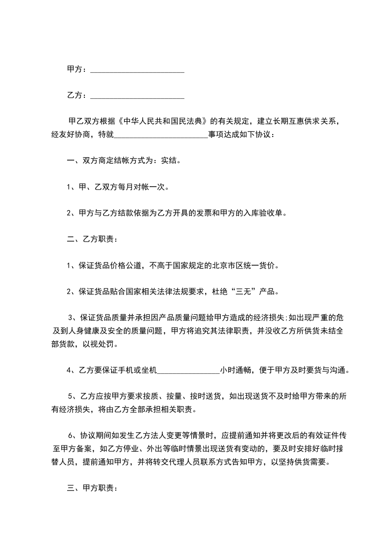 三、乙方所供食品的卫生、质量及包装等必须符合《中华人民共和国食品卫生法》的要求,如因食品本身质量问题引起甲方出现食物中毒等食品安全事故,由乙方承担一切法律责任及经济责任。