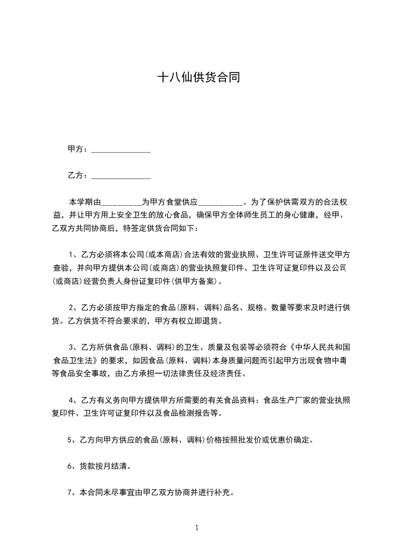 本学期由__________为甲方食堂供应___________。为了保护供需双方的合法权益,并让甲方用上安全卫生的放心食品,确保甲方全体师生员工的身心健康,经甲、乙双方共同协商后,特签定供货合同如下: