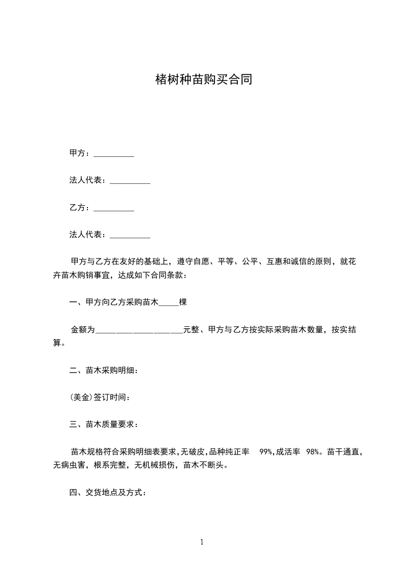 一、甲方向乙方采购苗木_______株,金额为人民币________.甲方与乙方按实际采购苗木数量,按实结算。