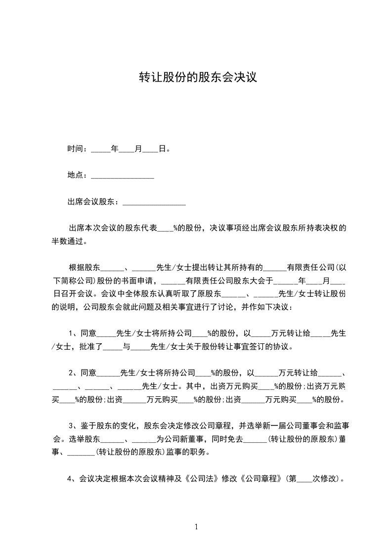 ____________________________有限公司于_____年_____月_____日在_________________________召开股东会会议,本次会议是根据公司章程规定召开的临时会议 ,于召开会议前依法通知了全体股东, 会议通知的时间、方式以及会议的召集和主持 符合公司章程的规定,出席本次股东会会议 的有股东_______和股东_______,全体股东均已到会。股东会会议一致通过并决议如下: