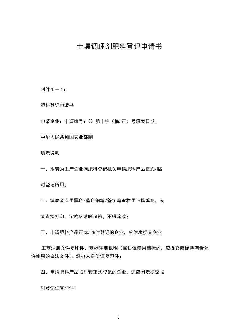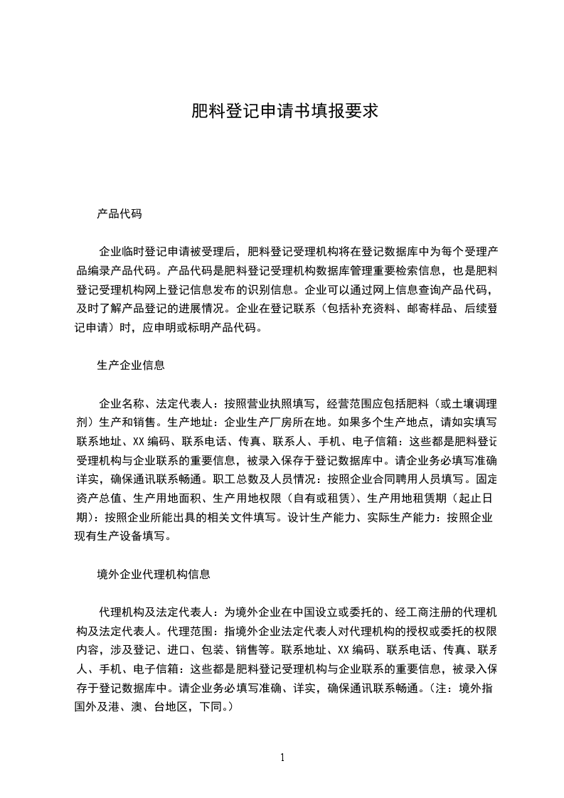 产品通用名称:请按照农业部“肥料登记目录及通用名称要求”填写,目录未列出的请空缺。产品商品名称:请按照农业部“肥料登记商品名称限用词库”填写,没有商品名称的请空缺。执行标准:请选择“执行强制性标准”或“执行企业标准”,若选择执行强制性标准,请注明标准号。产品形态:请选择“水剂”,或“粉剂”,或“颗粒”,或“其它”,若选择其它,请注明形态。产品外观:请详细描述产品的颜色或杂色、均匀度、杂质等外观。技术要求:请按产品所含成分如实填写。土壤调理剂产品技术要求仅在土壤调理剂和有机成分栏中填写。申请书中未列出的,请在空栏中填写。注意水剂产品应按法定计量单位g/L的值填写。境外产品在生产国或地区获准登记许可的时间:请如实填写。产品在其他国家或地区获准登记许可的情况:指境内企业和境外企业在非生产国或地区获准登记许可的情况。