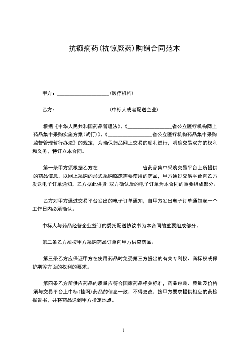 根据《中华人民共和国药品管理法》、《__________________省公立医疗机构网上药品集中采购实施方案(试行)》、《__________________省公立医疗机构药品集中采购监督管理暂行办法》的规定,为确保药品网上交易的顺利进行,明确交易双方的权利和义务,特订立本合同。