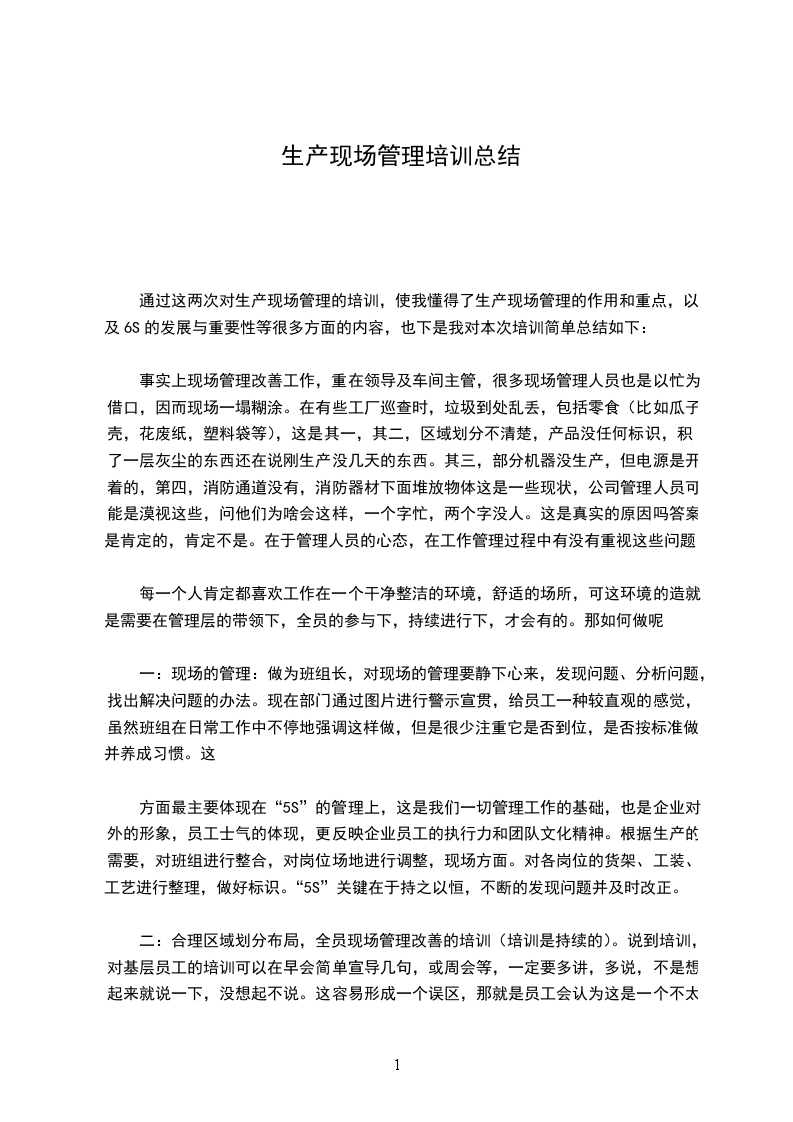 通过这两次对生产现场管理的培训,使我懂得了生产现场管理的作用和重点,以及6S的发展与重要性等很多方面的内容,也下是我对本次培训简单总结如下: