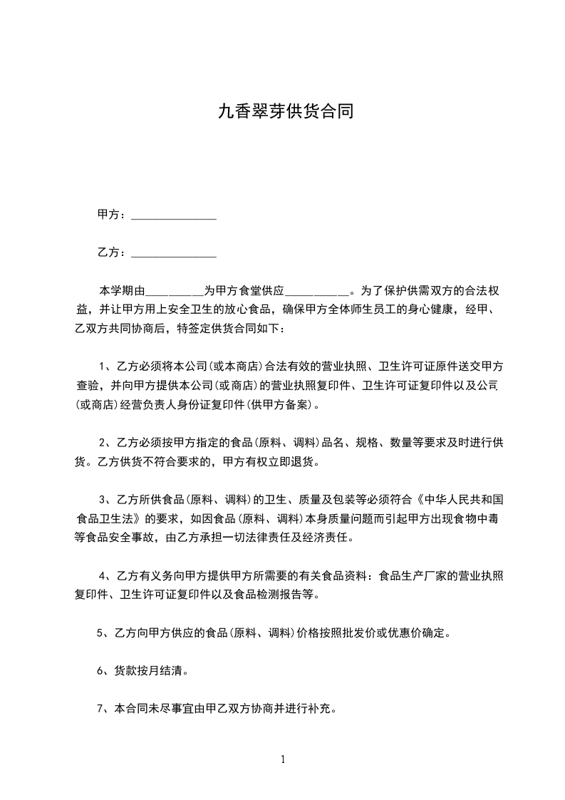 本学期由__________为甲方食堂供应___________。为了保护供需双方的合法权益,并让甲方用上安全卫生的放心食品,确保甲方全体师生员工的身心健康,经甲、乙双方共同协商后,特签定供货合同如下: