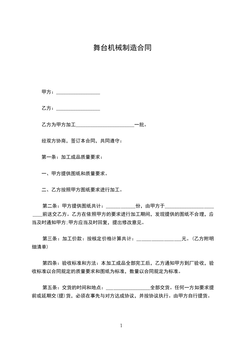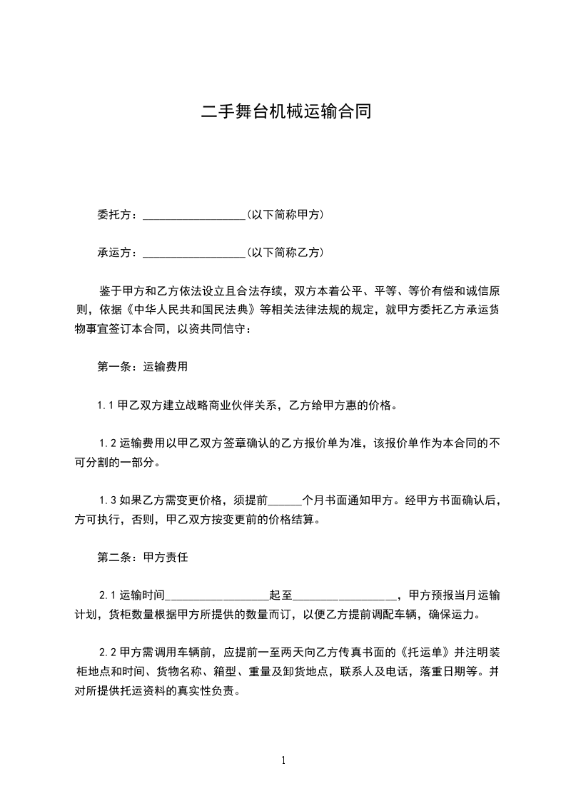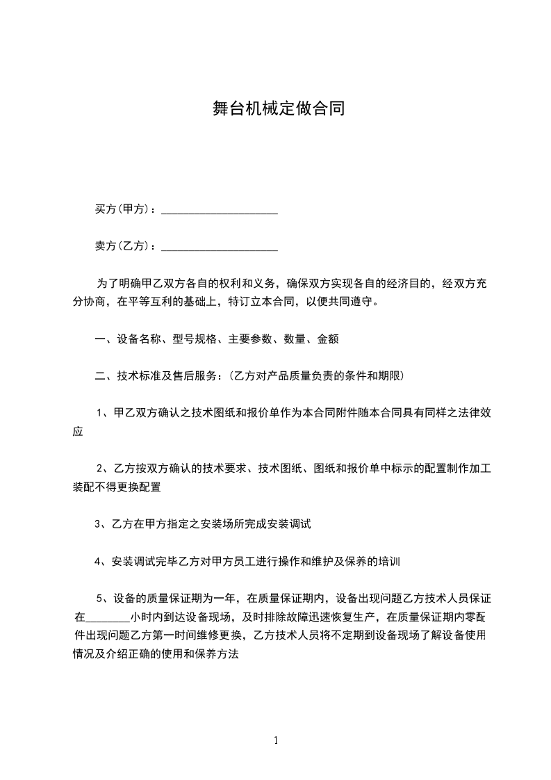 一、甲方同意将自有的__________________(该机编号为:__________________)出售给乙方,经乙方负责人及技术人员现看、试机后,以协定价格为人民币¥:__________________元(__________________元整)。