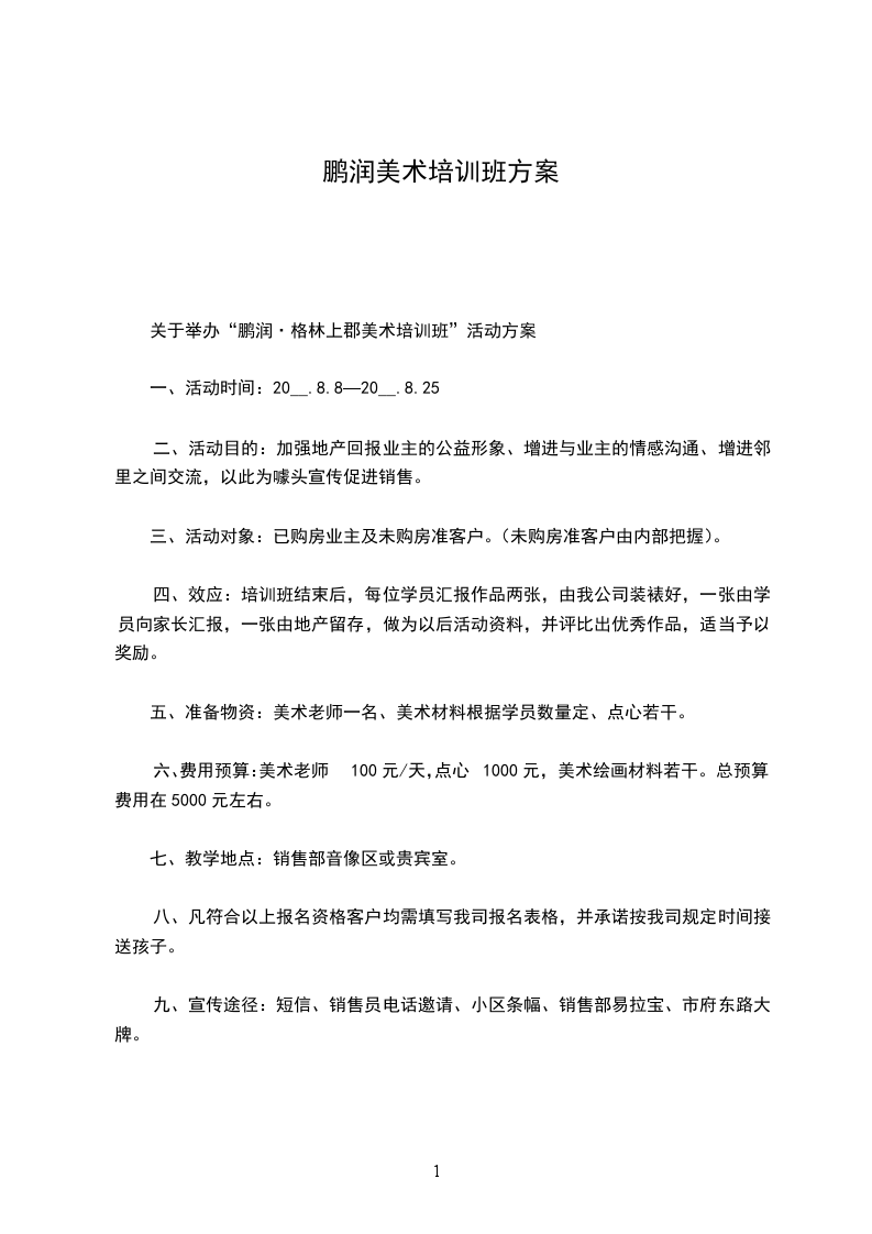 关于举办“鹏润·格林上郡美术培训班”活动方案