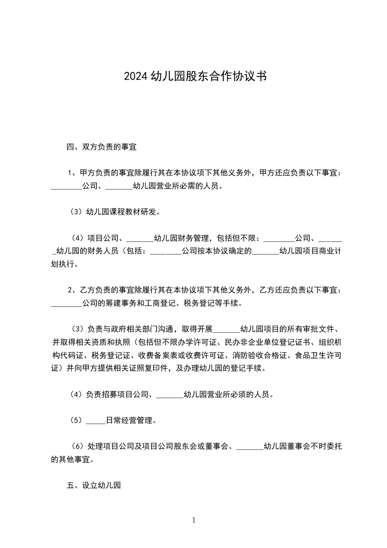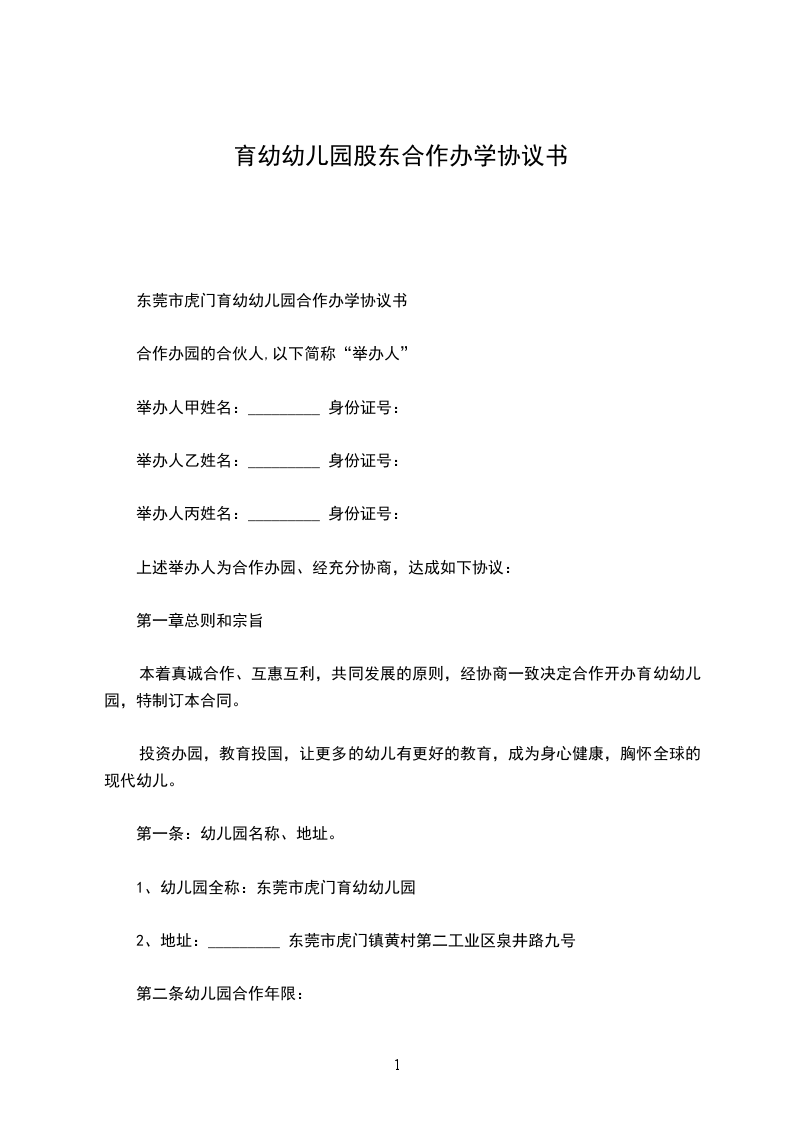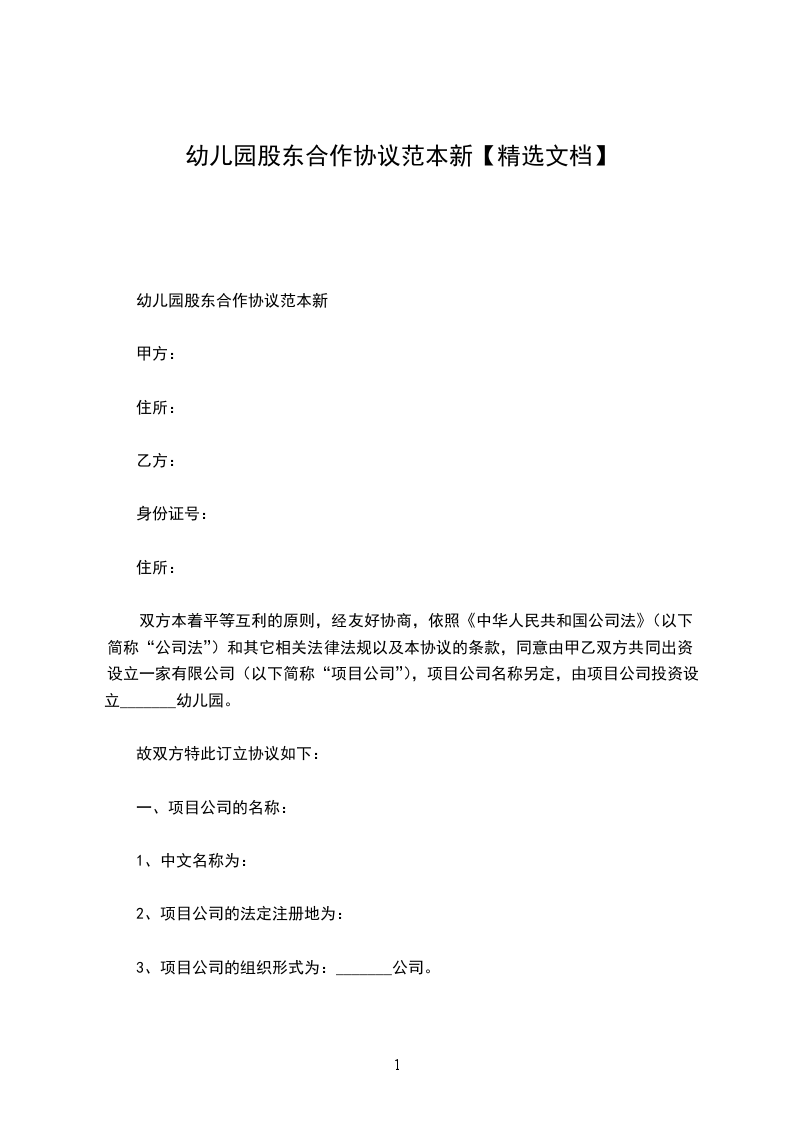 双方本着平等互利的原则,经友好协商,依照《中华人民共和国公司法》(以下简称“公司法”)和其它相关法律法规以及本协议的条款,同意由甲乙双方共同出资设立一家有限公司(以下简称“项目公司”),项目公司名称另定,由项目公司投资设立_______幼儿园。