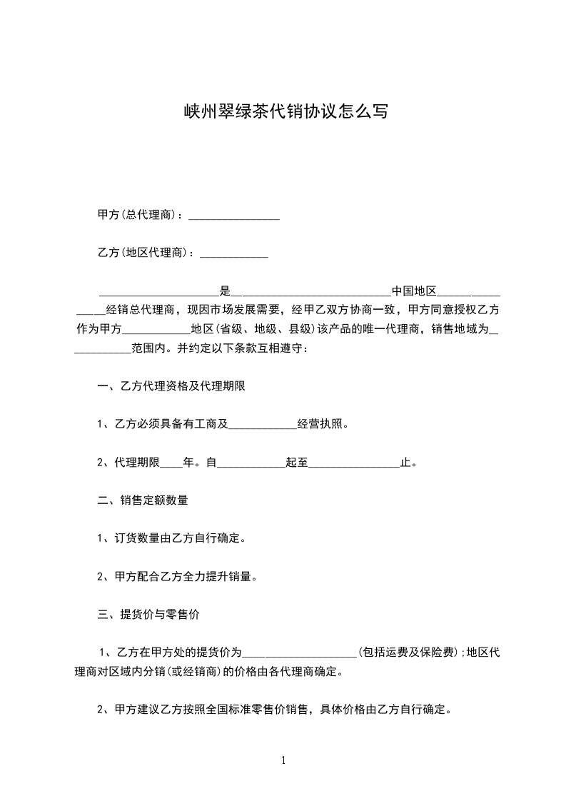 六、市场维护:为了维护整体市场及双方共同利益,经甲、乙双方共同协商一致,乙方在销售过程中产品的正常零售价应不低于甲方供价的_______%-_______%之间进行销售,以免因销价低而影响整体市场或因价格过高而导致商品滞销。