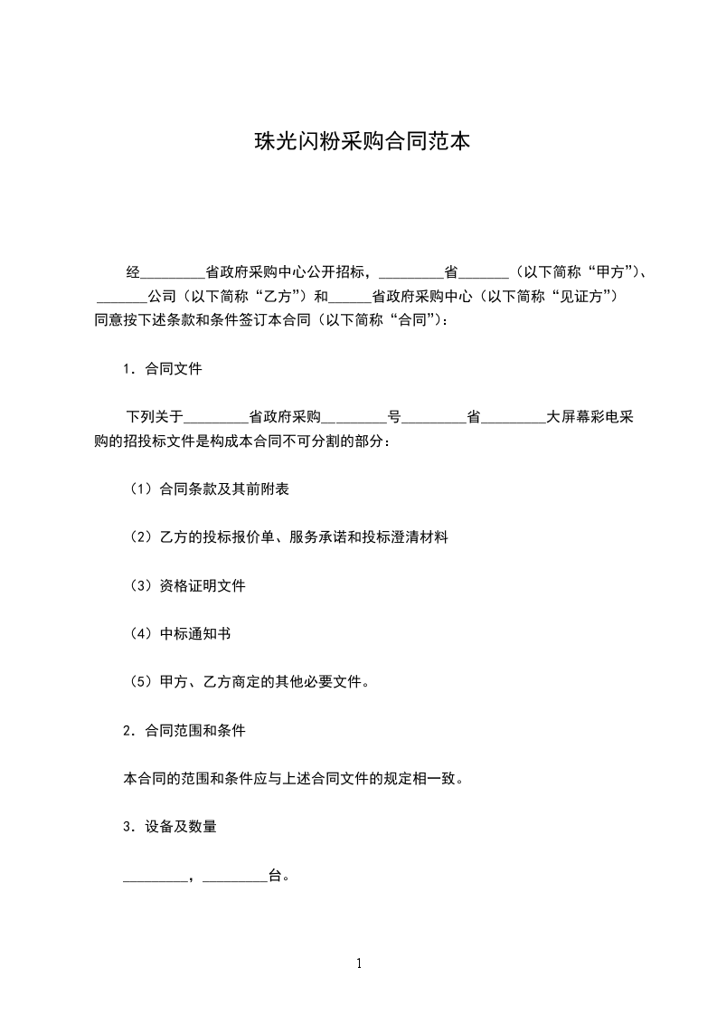 经_________省政府采购中心公开招标,_________省_______(以下简称“甲方”)、_______公司(以下简称“乙方”)和______省政府采购中心(以下简称“见证方”)同意按下述条款和条件签订本合同(以下简称“合同”):