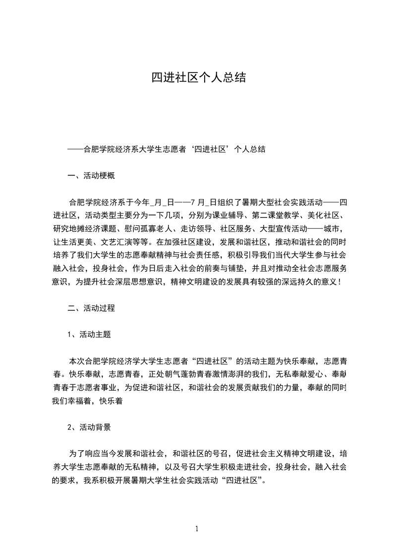 合肥学院经济系于今年_月_日——7月_日组织了暑期大型社会实践活动——四进社区,活动类型主要分为一下几项,分别为课业辅导、第二课堂教学、美化社区、研究地摊经济课题、慰问孤寡老人、走访领导、社区服务、大型宣传活动——城市,让生活更美、文艺汇演等等。在加强社区建设,发展和谐社区,推动和谐社会的同时,培养了我们大学生的志愿奉献精神与社会责任感,积极引导我们当代大学生参与社会,融入社会,投身社会,作为日后走入社会的前奏与铺垫,并且对推动全社会志愿服务意识,为提升社会深层思想意识,精神文明建设的发展具有较强的深远持久的意义!
