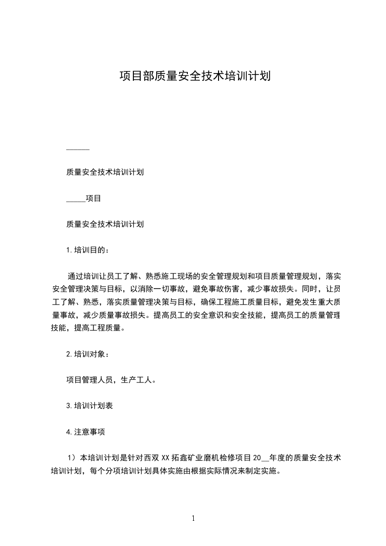 1)本培训计划是针对西双XX拓鑫矿业磨机检修项目20__年度的质量安全技术培训计划,每个分项培训计划具体实施由根据实际情况来制定实施。