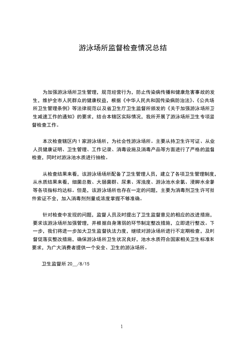 本次检查辖区内1家游泳场所,为社会性游泳场所。主要从持卫生许可证、从业人员健康证明、卫生管理、工作记录、消毒设施及消毒产品等方面进行了严格的监督检查,同时对游泳池水质进行抽检。