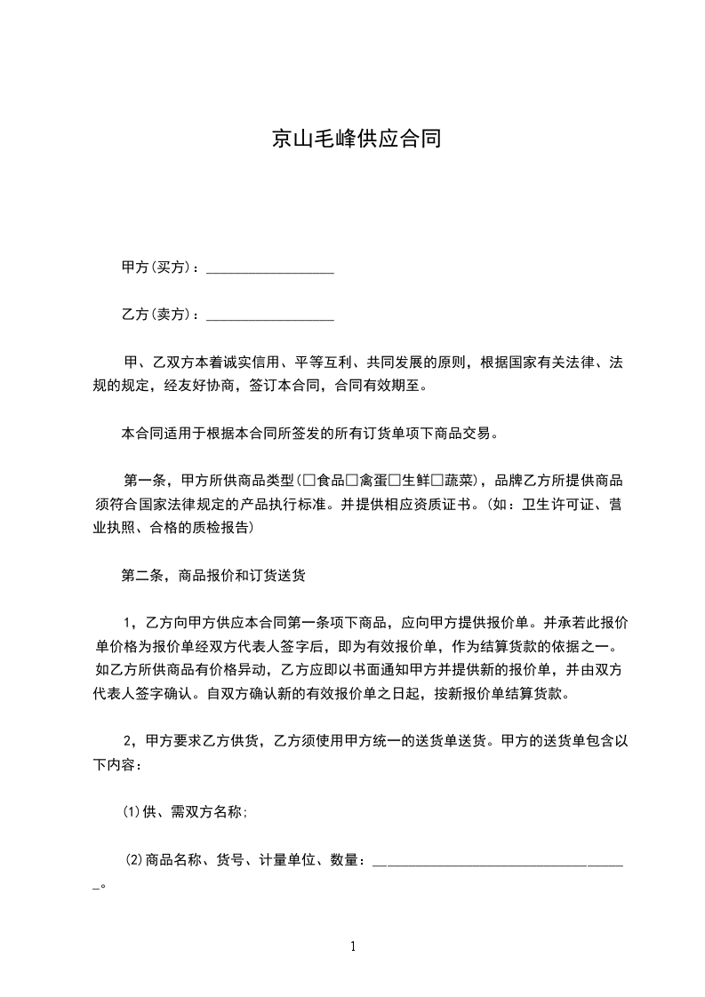 第一条,甲方所供商品类型(□食品□禽蛋□生鲜□蔬菜),品牌乙方所提供商品须符合国家法律规定的产品执行标准。并提供相应资质证书。(如:卫生许可证、营业执照、合格的质检报告)