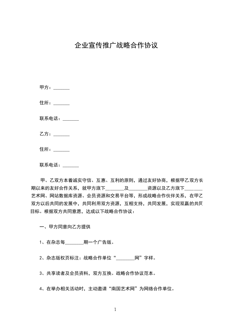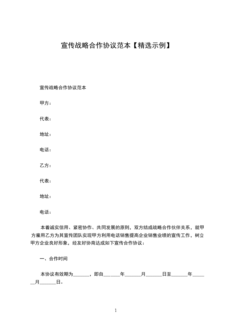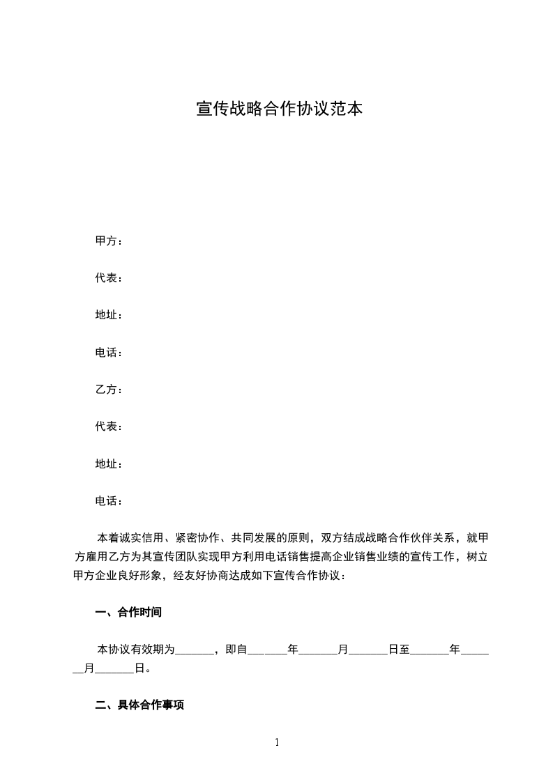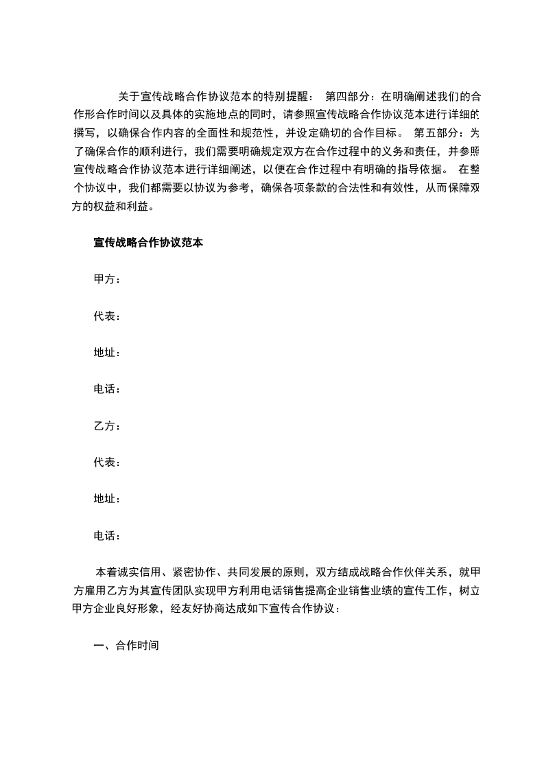 本着诚实信用、紧密协作、共同发展的原则,双方结成战略合作伙伴关系,就甲方雇用乙方为其宣传团队实现甲方利用电话销售提高企业销售业绩的宣传工作,树立甲方企业良好形象,经友好协商达成如下宣传合作协议: