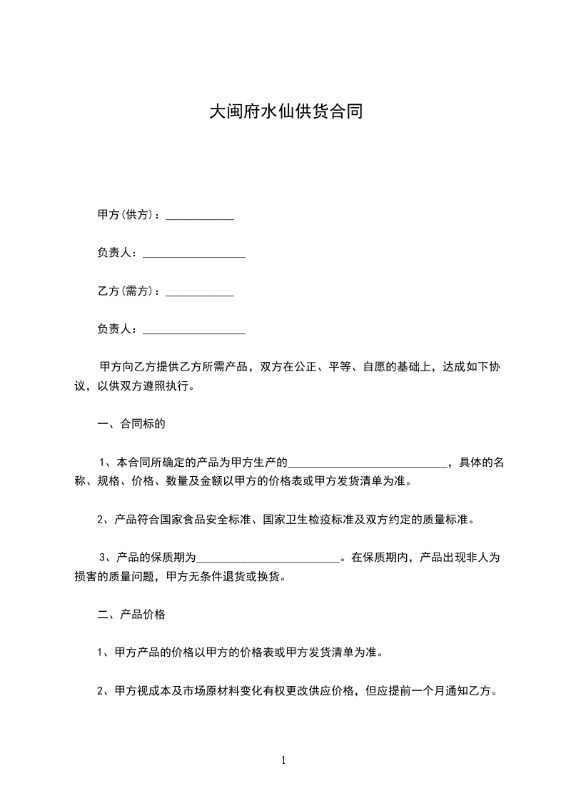 1、本合同所确定的产品为甲方生产的____________________________,具体的名称、规格、价格、数量及金额以甲方的价格表或甲方发货清单为准。