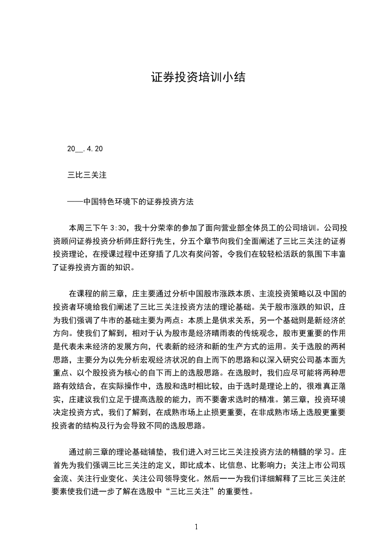 以前一直以为炒股完全靠的是运气,但是学习了证券投资这门课程,我对股票、对投资有了深入的了解和体会,懂得了投资和炒股都是需要一定的证券知识和技术分析的。结合我在实习的公司学习网上模拟炒股投资,使我对炒股的流程有了一定的了解。但是我知道这都是最初步、最基础的,要想学好证券投资并且