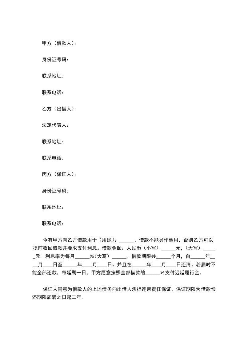 今有甲方向乙方借款用于(用途):______,借款不能另作他用,否则乙方可以提前收回借款并要求支付利息。借款金额:人民币(小写)______元,(大写)______元。利息率为每月______%(大写)______。借款期限共______个月,自______年____月____日至______年____月____日。并且在______年____月____日还清。若届时不能全部还款,每延期一日,甲方愿意按照全部借款的______%支付迟延履行金。