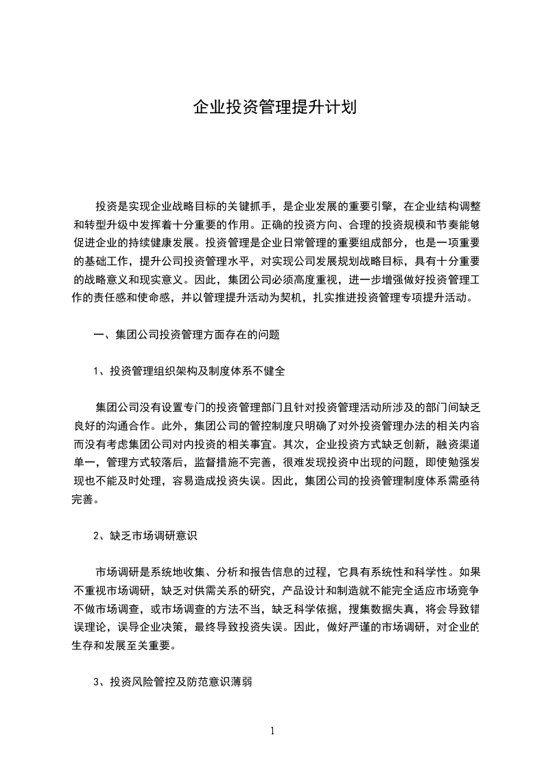 1、高度重视投资管理提升工作,健全投资管理组织架构和制度体系。管理要依法而行,管理要建章健制,形成一套真正制度化、规范化、科学化的投资管理方法,按照投资建议、可行性论证、投资决策、投出资产处置和销售等环节对投资实施全程控制和监督。健全投资管理机构,完善投资决策机制、管理机制和监督机制,制定严格的投资管理制度。界定关键区域的责权利,既要防止权力重叠,又要避免权力真空。实施必要的责任追究机制和合理奖惩办法,形成齐抓共管之势,产生管理协同效应。力争每一项投资都能做到高起点设计、高标准运行、高效能管理、事前论证民主科学、事中监督及时有效、事后考核评价准确。