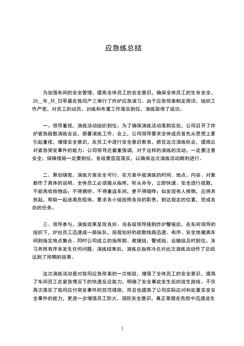 为加强车间的安全管理,提高全体员工的安全意识,确保全体员工的生命安全,20__年_月_日早晨在我司产三举行了炸炉应急演习。由于应急预案制定周详,组织工作严密,对员工的动员、训练和布置工作落实到位,演练取得了成功。