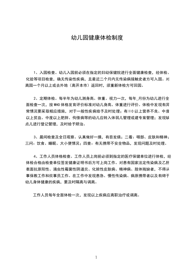 4、工作人员体格检查。工作人员上岗前必须到指定的医疗保健单位进行体检,经体检合格由检查单位签发健康证明书后方可上岗工作。对患有国家法定传染病及乙肝表面抗原阳性、滴虫性霉菌性阴道炎、化脓性皮肤病、精神病、肢体残缺者,不得从事保教工作和炊事员工作。在工作中发现患急、慢性传染病、病原携带者以及有碍于幼儿身体健康的疾病,要及时隔离与调离。