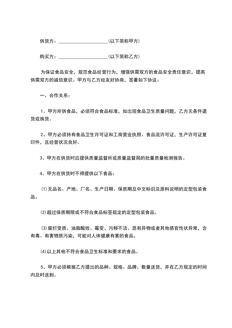 为保证食品安全,规范食品经营行为,增强供需双方的食品安全责任意识,提高供需双方的诚信意识。甲方与乙方经友好协商,签署如下协议:
