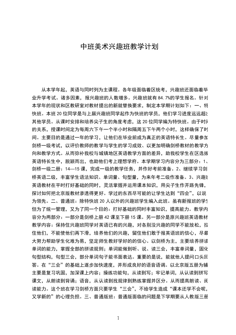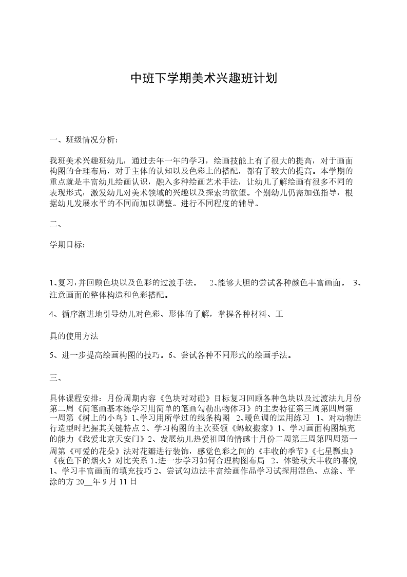 中班美术兴趣班计划幼儿美术教育活动的内容涵盖了幼儿生活的全部,幼儿的所见所闻,包括对周围环境的人物、动物、植物、风格、建筑、各种有趣的玩具和幼儿园的生活游戏等等,都是通过美术活动体现出来。出于对美术的热爱,本学期我将继续担任中班美术兴趣班的授课教师。制定的学期目标及课时安排如下: