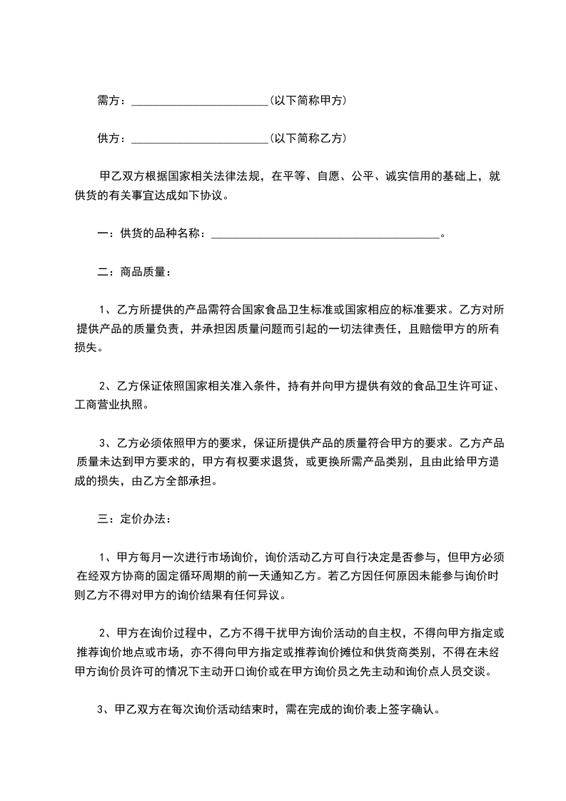 为保证食品安全,规范食品经营行为,增强供需双方的食品安全责任意识,提高供需双方的诚信意识。甲方与乙方经友好协商,签署如下协议: