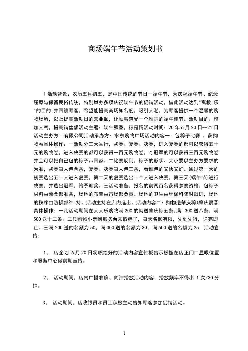 1活动背景:农历五月初五,是中国传统的节日--端午节,为庆祝端午节、纪念屈原与保留民俗传统,特别举办多项庆祝端午节的促销活动,借此活动达到"寓教 乐"的目的;并回馈顾客,希望能提高商场知名度,吸引人潮,为顾客提供一个温馨的购物场所,以及提高活动日的营业额,让顾客感受一个难忘的端午佳节。活动目的:增加人气,提高销售额活动主题:端午飘香,粽是情活动时间:20年6月20日--21日活动主办方:有限公司活动承办方:水东购物广场活动内容一:包粽子比赛 ,获购物卷具体操作:一活动分三天举行,初赛、复赛、决赛,进入复赛的都可以获得五十元的购物卷,进入决赛的都可以获得一百元购物卷,夺冠军的可以获得三百元购物卷,并且可以把自己包的粽子带回家。二比赛规则,粽子的形状、大小要以主办方要求的为准,初赛每人包两条,复赛、决赛每人包三条,看谁包的又快又好。通过第一天的初赛选出五十人进入复赛,第二天的复赛选出十个人进入决赛,第三天(端午节)进行决赛,并选出冠军,给予颁奖。三活动准备,报名的前两百名获得参赛资格,包粽子材料由熟食部准备,场地的布置由市场部负责。场地的卫生由环保科随时跟进,场地的秩序由防损部维 持。活动主持在店内选出。活动内容二:购物送肇庆粽(肇庆裹蒸)具体操作:一凡活动期间在人人乐购物满200的就送肇庆粽五条,满300送八条,满500送十二条。二凭购物小票到服务台领取粽子,每天名额有限,先到先得,送完即止。三满200送的名额为50,满300送的名额为30,满500送的名额为25. 活动宣传: