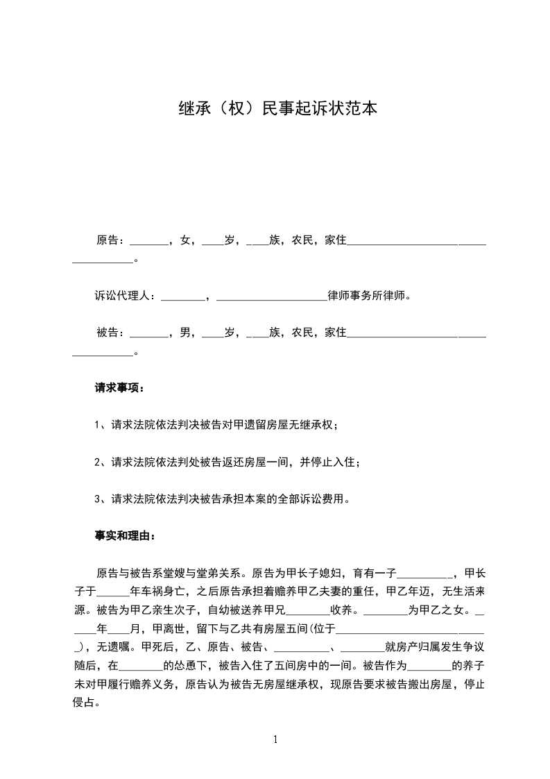 原告:_______,女,____岁,____族,农民,家住____________________________________。