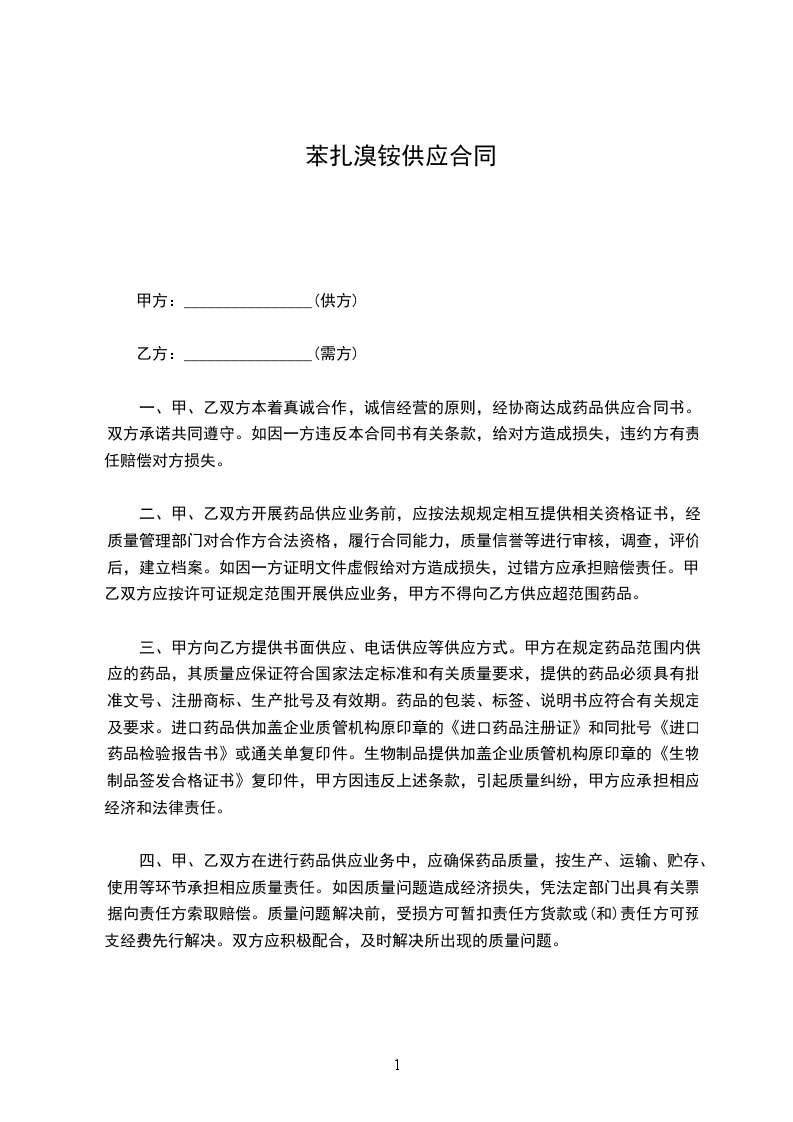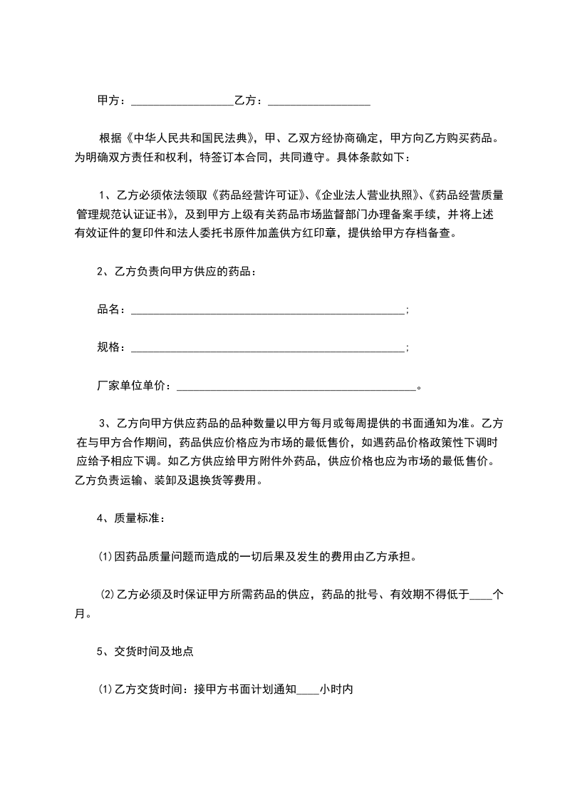 根据《中华人民共和国民法典》,甲、乙双方经协商确定,甲方向乙方购买药品。为明确双方责任和权利,特签订本合同,共同遵守。具体条款如下: