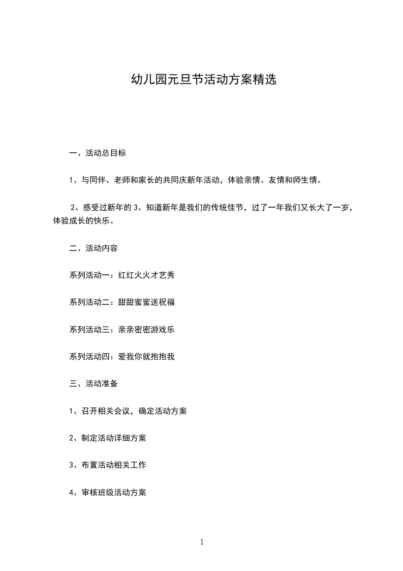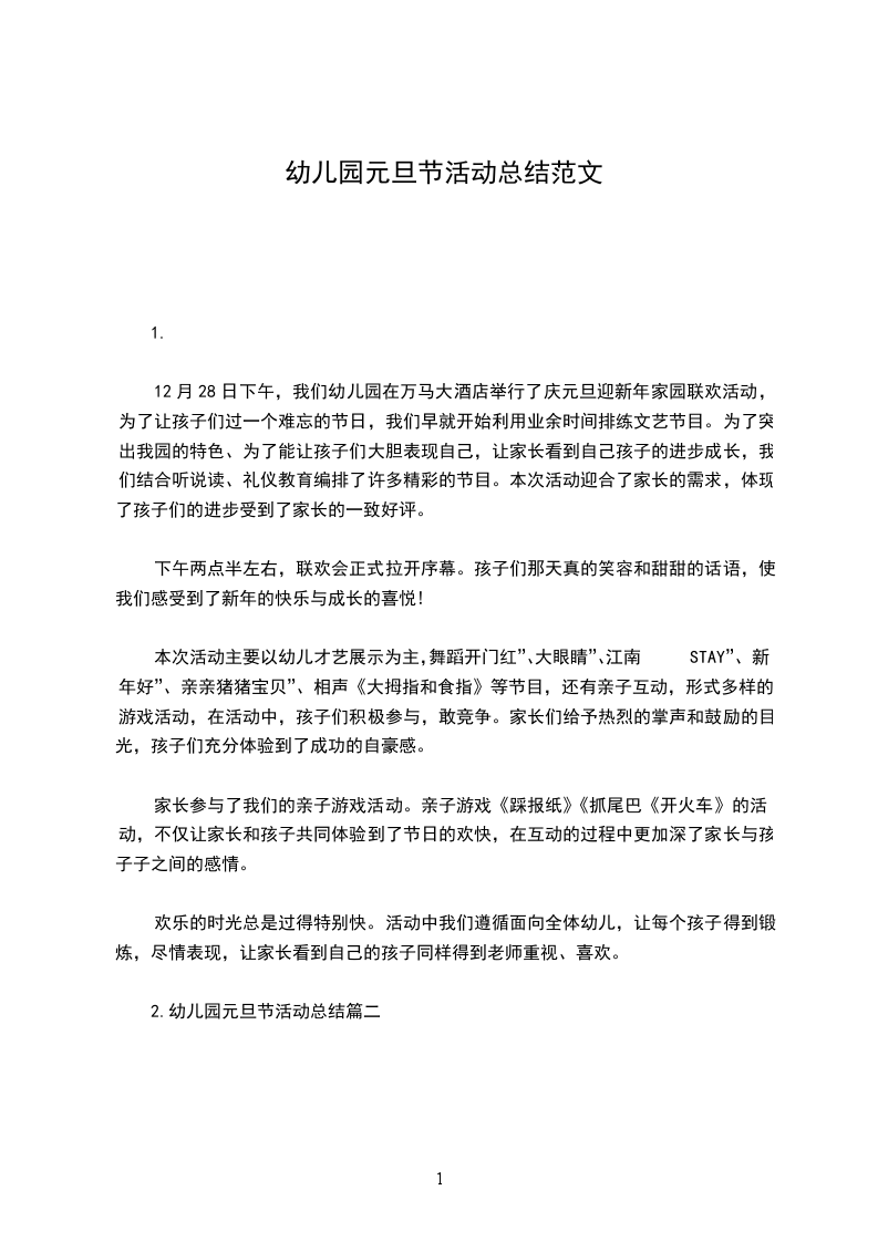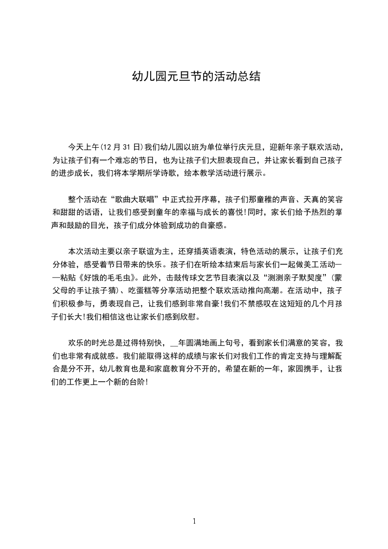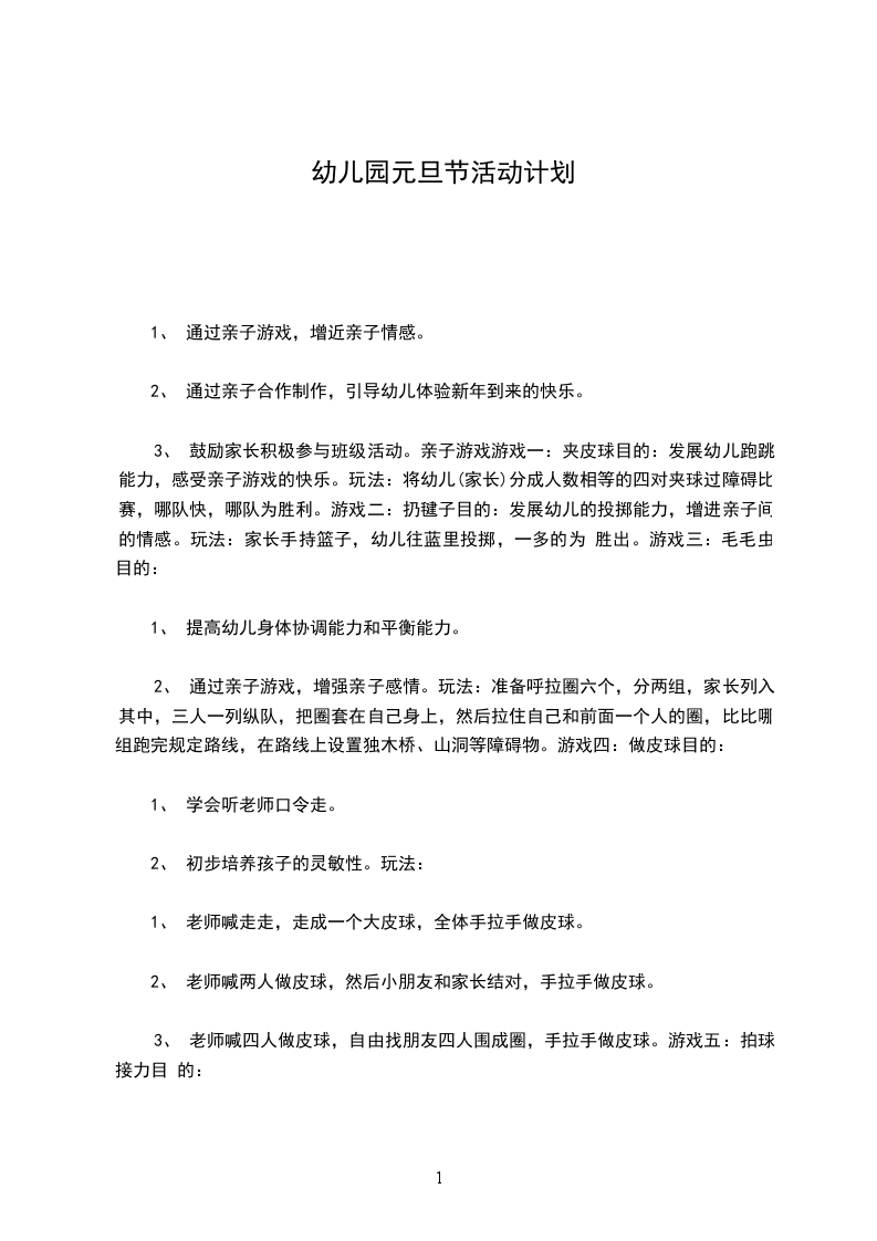 三、 活动过程:来园活动(各班教室)生活活动新年心愿包活动准备:红信封、纸、蜡笔、记号笔玩法:各班家长和孩子共同在纸上画或写新年心愿,再装入红信封袋内。亲子运动会准备:场地布置、主持人一名、音乐(新年好)过程:1)律动“新年好”2)亲子运动游戏放鞭炮准备:每班自制炮竹一个玩法:分小班组,托班组。每班出6对家长和孩子。将幼儿和家长分成一一对应,面对面排。开始由幼儿手捧“爆竹”由起点跑向自己的家长,当家长接过“爆竹”后,双手上举,口中喊道“砰啪”此资料由 网络收集而来,如有侵权请告知上传者立即删除。,就算送到一个。然后孩子再将“爆竹”运回给下一名幼儿手中,看哪对先放完。运彩球准备:彩色的球、圈玩法:适用 小班幼儿,每班10名幼儿,分两对面站立,用圈赶彩球行进走,走至对面交给另一位幼儿,依次往返接力。剥桔子:准备:小桔子50只,椅子3个,垃圾筐每班5对家长和孩子玩法:幼儿从起点跑到终点拿一个桔子,跑回来剥掉皮给家长吃,第二个幼儿继续,以此类推,看哪队最快为胜。抢气球游戏:准备:凳子或椅子;各色气球;拴气球的绳子。玩法:老师或主持人发出指令,复习颜色。如果说 红色就要跑到拴有红色气球的椅子旁,用力把气球坐爆。分组比赛,小组第一晋级下一轮,直到轮完初赛,最后小组第一之间进行决赛,分出获胜者。请几位家长带着小朋友一起听主持人发令,按照规则进行。开火车:准备:起跑处标志玩法:由家长或老师(6——8人)组成一列火车,蹲着行进走,以先到的一列火车为胜。(必须下蹲走)袋鼠跳准备:大袋子四个,可以用面粉包装袋之类的,要大一些玩法:一名小朋友与自己的爸爸或妈妈组成一组,每次游戏找四组为一单位,小朋友与家长面对面站立,中间距离约30~5 0米。游戏开始后,小朋友要拿起放在地上的大袋子,跑向自己的爸爸妈妈,爸爸妈妈接到袋子后,要马上套住自己的双腿,跳回孩子的起始位置,以速度定输赢。揪尾巴准备:纸尾巴若干条。玩法:一家三口组成一条牛。爸爸为牛头,妈妈的手搭在爸爸的肩上为牛身,孩子紧贴妈妈身后做牛尾,孩子裤腰上别上牛尾巴。在一定范围场地内,几个家庭展开揪尾巴比赛。最后看哪个牛头揪到的尾巴多,哪个家庭就获胜。赶双球准备:一大一小皮球为一对,共若干对;网球拍若干副。玩法:适用 大班的游戏。一家三口为一组,爸爸站在终点线,由妈妈和孩子在起点处各持一网球拍赶球(妈妈赶大球,孩子赶小球),要求 两球同时到达终点,然后再由爸爸一人持双球拍把两球同时赶回起点。幼儿园元旦节活动计划