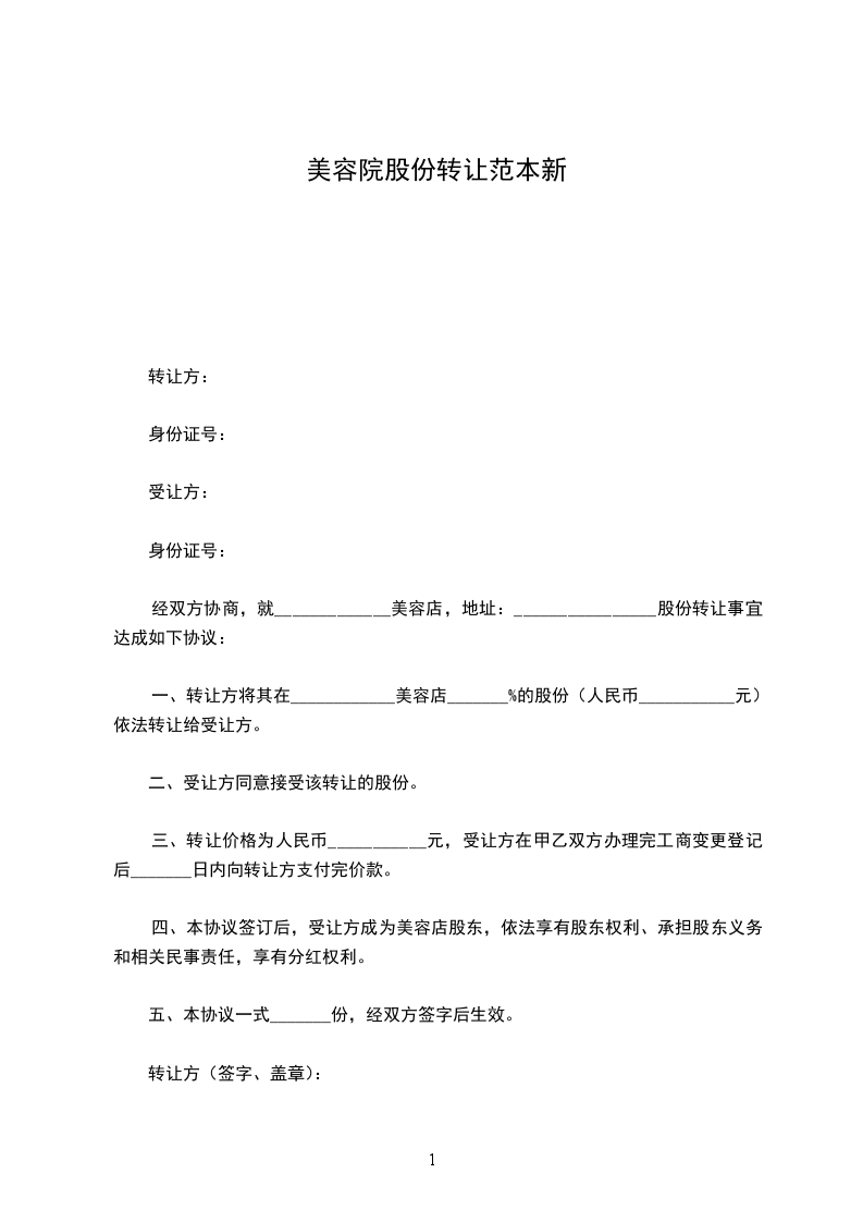 一、转让方将其在____________美容店_______%的股份(人民币___________元)依法转让给受让方。