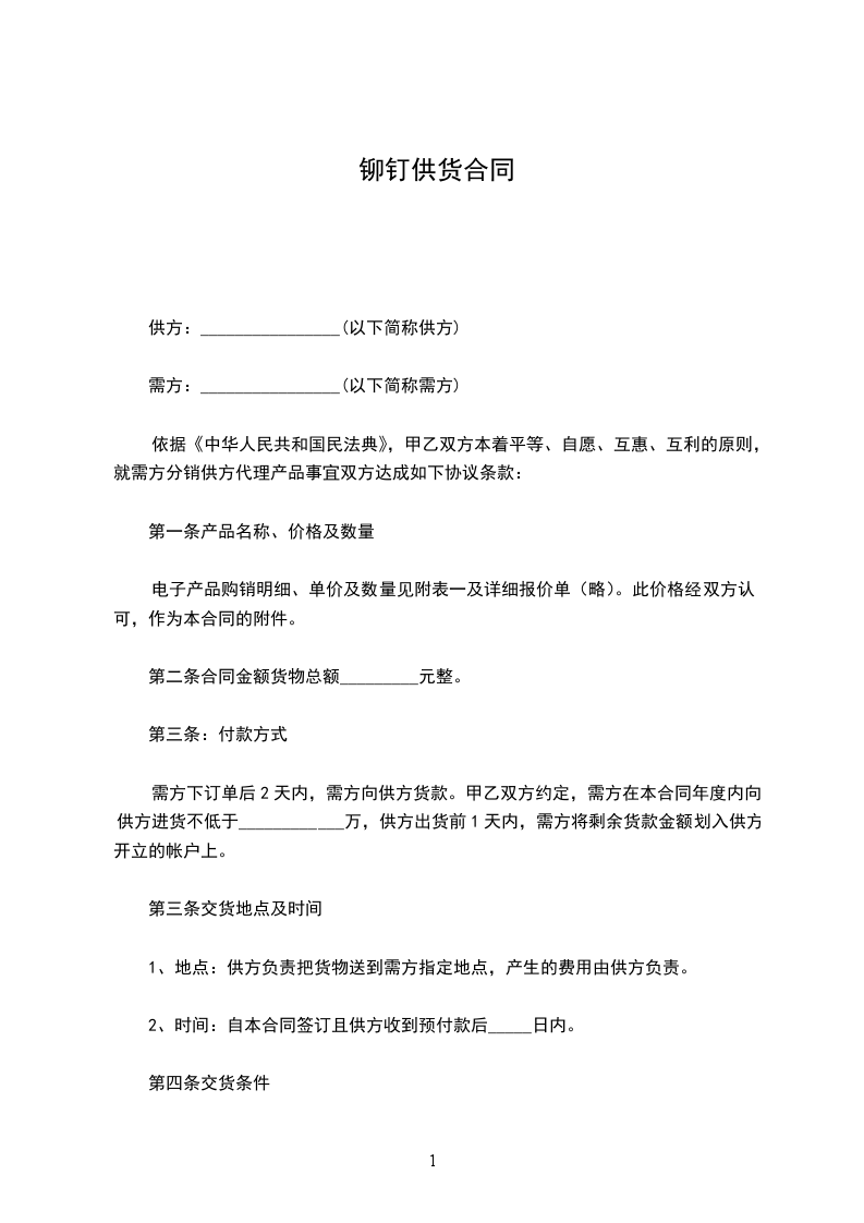 需方下订单后2天内,需方向供方货款。甲乙双方约定,需方在本合同年度内向供方进货不低于____________万,供方出货前1天内,需方将剩余货款金额划入供方开立的帐户上。