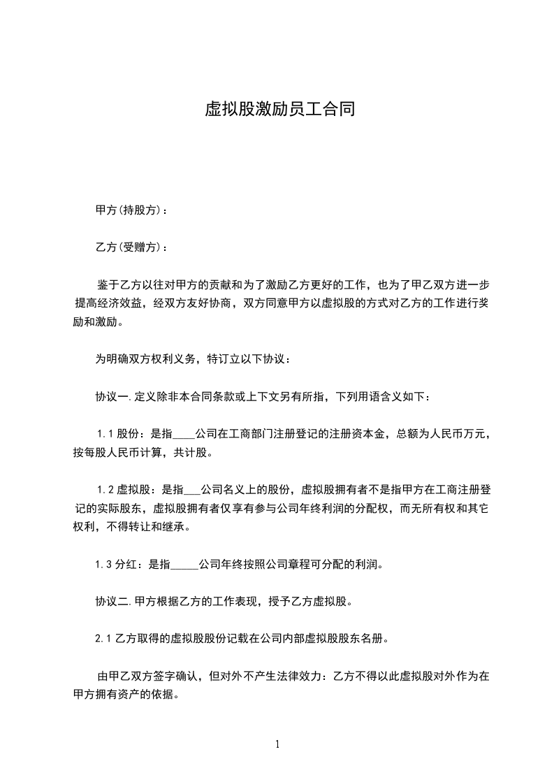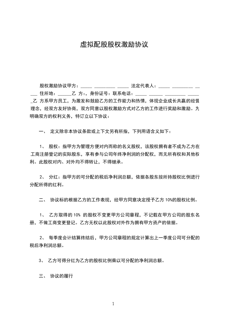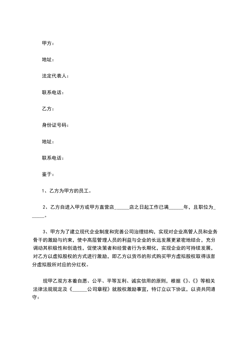 二、 协议标的根据乙方的工作表现,甲方经过全体股东一致同意,决定授予乙方的虚拟股权。