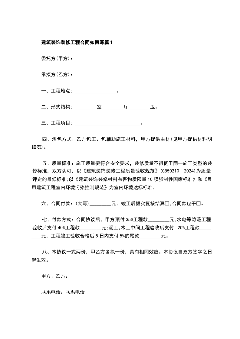 五、质量标准:施工质量要符合安全要求,装修质量不得低于同一施工类型的装修标准,双方认可,以《建筑装饰装修工程质量验收规范》(GB50210—2024)为质量评定的最低标准;以《建筑装饰装修材料有害物质限量10项强制性国家标准》和《民用建筑工程室内环境污染控制规范》为室内环境达标标准。
