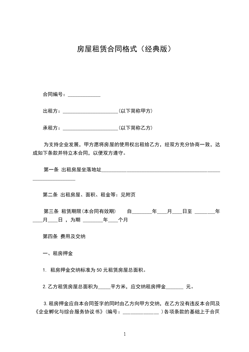 为支持企业发展,甲方愿将房屋的使用权出租给乙方,经双方充分协商一致,达成如下条款并特立本合同,以便双方遵守。