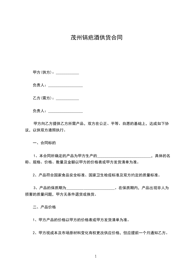 一、供货产品:甲方向乙方带给其总经销的商品供乙方超市销售,详细供货商品名称由乙方参见甲方所带给的商品目录,由乙方自行选定。