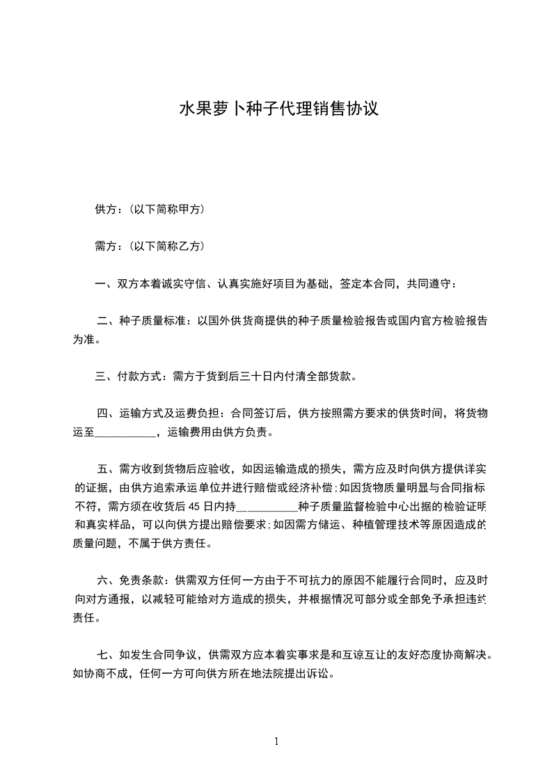 一、农作物种子的种类、品种、质量、数量、金额作物种类品种名称数量计量单位质量(%)单价________(元)总金额________(元)纯度净度发芽率水分________合计人民币金额(大写):________万________仟________佰________拾________元________角分。