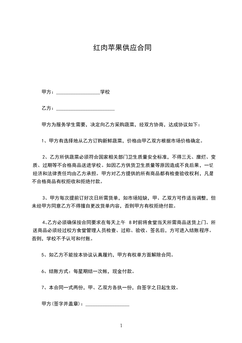 1、甲方每星期在乙方采购蔬菜一次或者两次(不得在其他市场或摊点购买)。