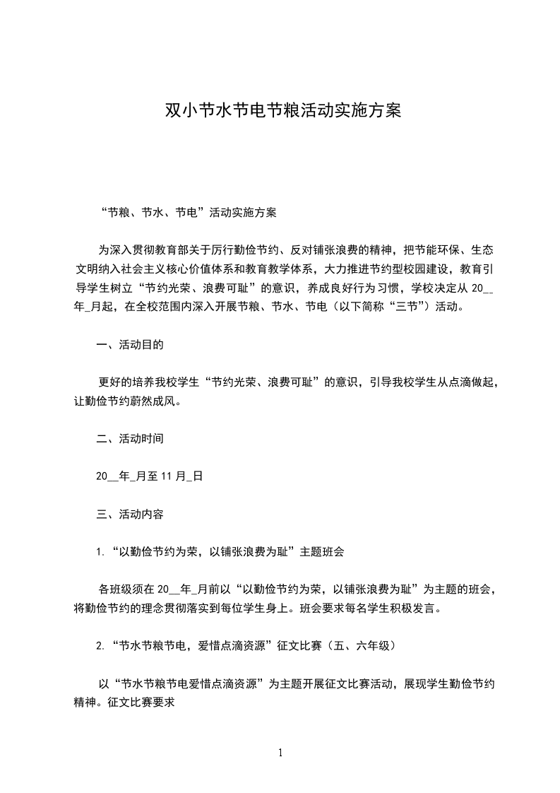 为深入贯彻教育部关于厉行勤俭节约、反对铺张浪费的精神,把节能环保、生态文明纳入社会主义核心价值体系和教育教学体系,大力推进节约型校园建设,教育引导学生树立“节约光荣、浪费可耻”的意识,养成良好行为习惯,学校决定从20__年_月起,在全校范围内深入开展节粮、节水、节电(以下简称“三节”)活动。